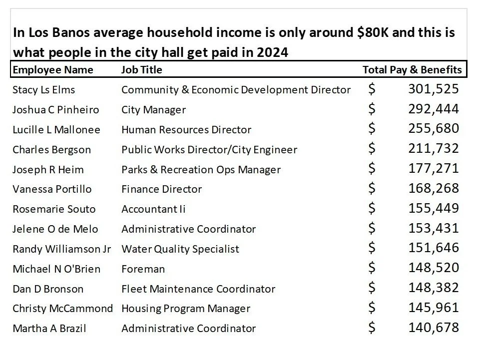 While small businesses in Los Banos navigate rising costs and constantly fail and residents stretch paychecks that look nothing like $301K, Los Banos City Hall remains confident that high-level compensation is essential to eventually stimulating prosperity—at least at the top.